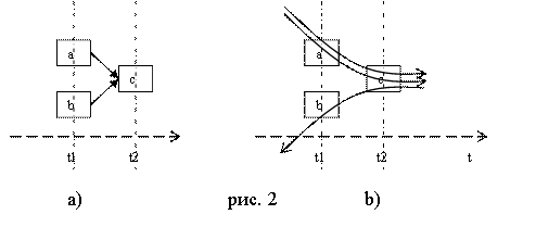 Как мы показали, состояния сознания субъекта образуют циклическую группу. То есть на этом множестве определено направление. Но различение направления времени еще не является необратимостью. При перемене знака времени все состояния субъекта будут воспроизведены в обратном порядке. Невозможность такой операции и следующая из этого необратимость возникают вследствие неполноты субъективной физической реальности. Элиминирование субъекта из мирового целого, то есть разбиение мира на субъект и объект приводит не только к нарушению симметрии, но и к возникновению ситуации неполноты, подобной той, которую исследовал К.Гедель в математике. Неполнота в нашем случае означает существование скрытых состояний не различимых субъектом. Как мы уже говорили, эти состояния образуют классы физических состояний или, что тоже самое – классы состояний сознания. Например, состояние сознания "верх" и состояние "низ" являются физическими состояниями, образующими базис для описания двухуровневых систем, например для описания спина электрона. Чтобы лучше понять, как возникает необратимость, рассмотрим 2 последовательных момента физического (субъективного) времени t2 > t1. Предположим, что в состояние "c" система может прийти двумя путями – из состояний a и b, соответственно (см. рис. 2).